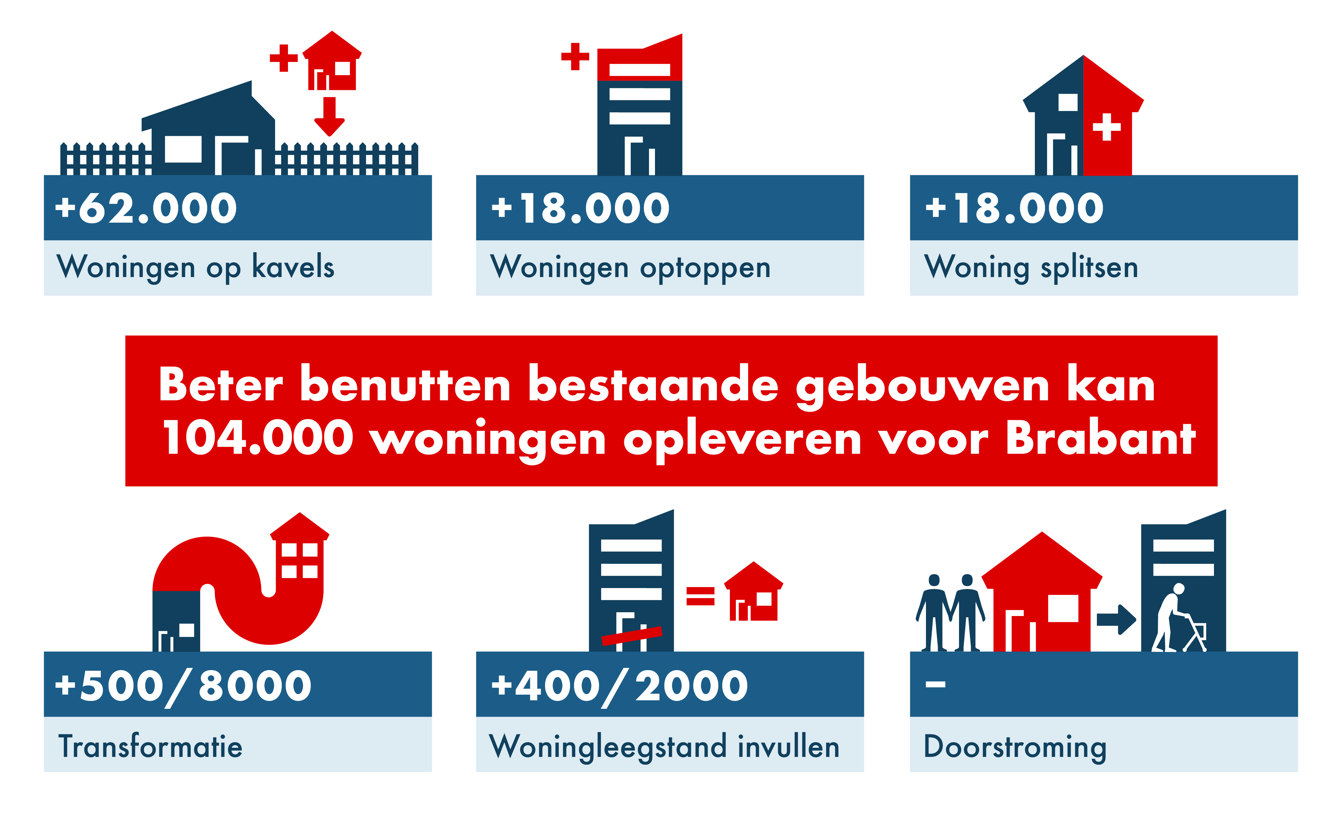 Het beter benutten van de bestaande woningen en gebouwen kan een serieuze bijdrage leveren in het realiseren van voldoende woonruimte voor de inwoners van Brabant. Denk hierbij aan het efficiënter gebruiken van bestaande kavels, het toevoegen van extra verdiepingen (optoppen), woningsplitsing, transformatie en leegstaande woningen weer bewonen. Ook het stimuleren van de doorstroming van ouderen naar een voor hen geschikte woning draagt bij aan een beter gebruik van bestaande woningen. De provincie wil stimuleren, dat de potentie van bestaande woningen en gebouwen ook daadwerkelijk benut gaat worden.