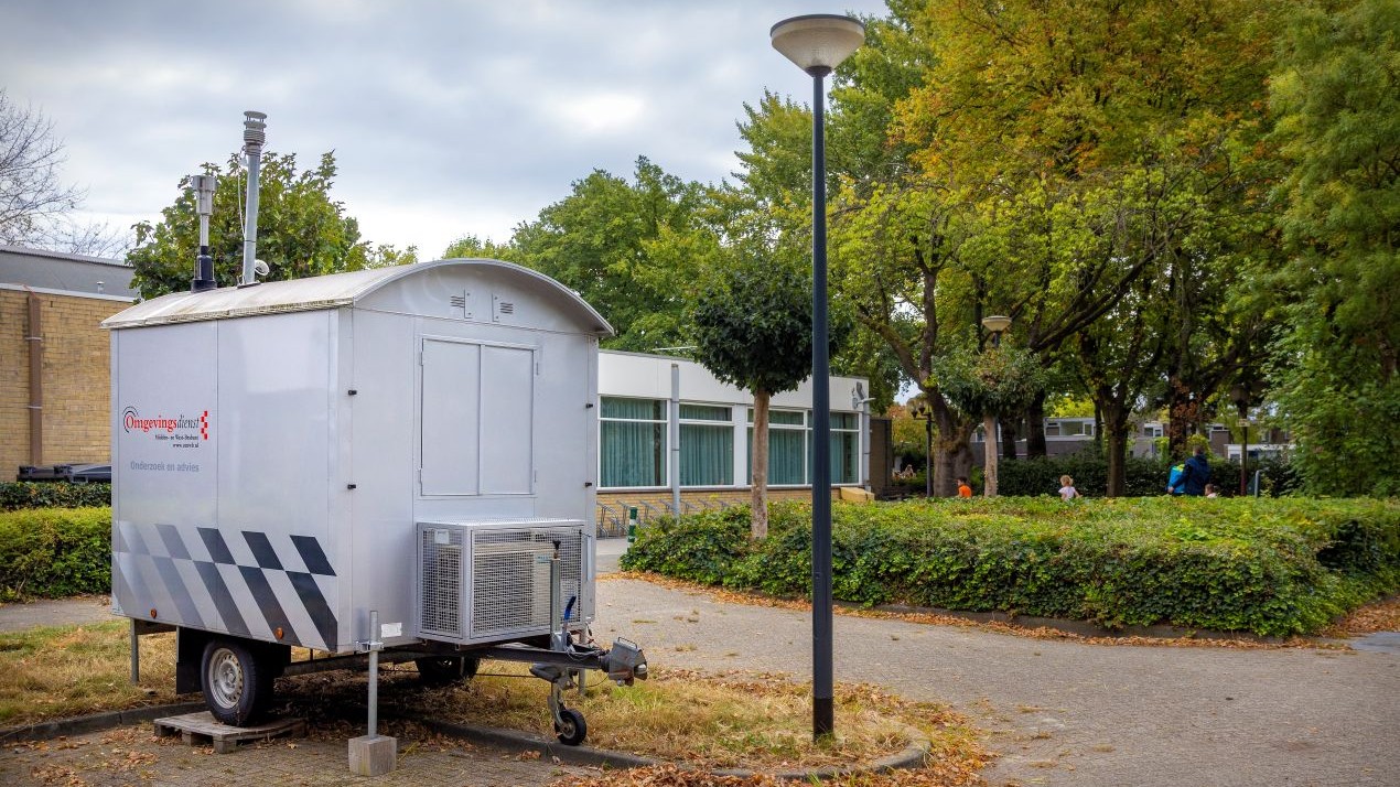 Twee mobiele luchtmeetstation van Provincie Noord-Brabant meten gedurende 5 jaar op verschillende plekken in Brabant de luchtkwaliteit. Dit op verzoek van gemeenten, burgers of burgerinitiatieven. Afbeelding: luchtmeetstation op de locatie Bavel in 2025